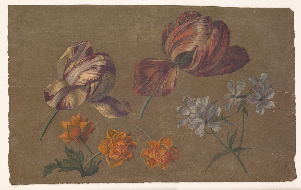 Deze losse bloemenstudies van Catharina Backer zijn waarschijnlijk net als de tekeningen in het album omstreeks 1710-1712 ontstaan. De amateur-kunstenares schilderde verschillende bloemensoorten, waarvan de weelderige koolroos haar favoriet was. Het is niet met zekerheid te zeggen of en bij wie Catharina schilder- en tekenlessen nam. Jan en Jacob van Huysum worden wel genoemd als haar mogelijke leermeesters, evenals Rachel Ruys. ( Bert Vreeken)