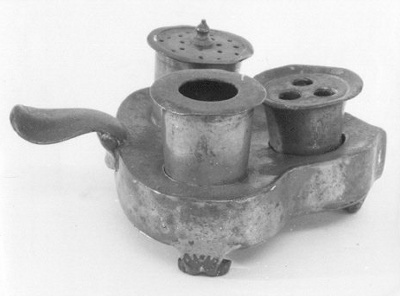 De houder is klaverbladvormig, in de uitsparingen zitten een inktkoker, een zandstrooier en een pennenbakje- Trefwoorden