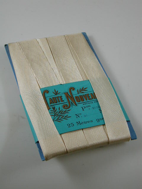 25 meter wit geweven lint, gewikkeld om karton. Daaromheen blauwe papieren wikkel, waarop gedrukte tekst- Trefwoorden