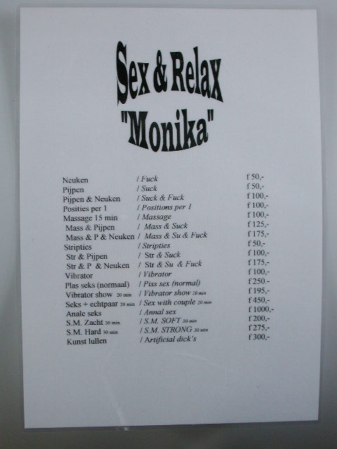 Ooit door politie in beslag genomen bij prostitutiebredrijf, omdat het adverteren met prijzen verboden is.- Trefwoorden