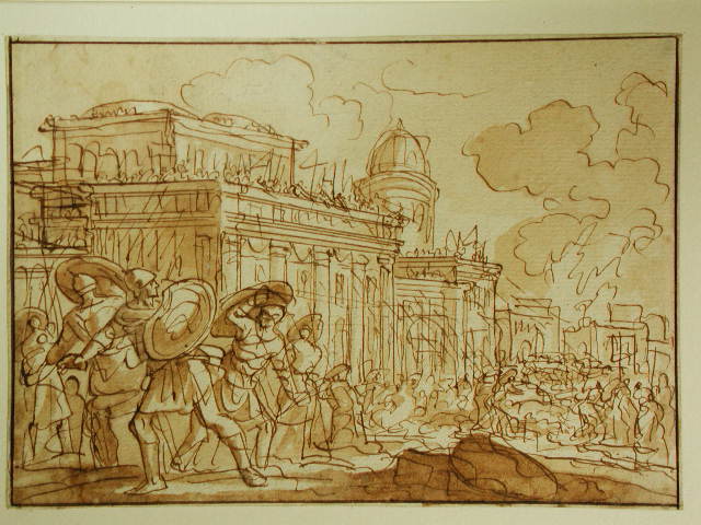 Jan Luyken was, evenals zijn zoon Caspar (1672–1708), een van de bekendste boekillustratoren van zijn tijd. Bijna alle tekeningen van zijn hand zijn dan ook voorstudies voor prenten in boeken. Het Amsterdams Historisch Museum bezit de grootste “Luyken”-verzameling ter wereld, bestaande uit tekeningen, prenten en boeken, die nog steeds actief aangevuld wordt met nieuwe aanwinsten, zoals deze tekening. Het is een voorstudie voor een prent in het boek Alle de werken van Flavius Josephus, uitgegeven in Amsterdam in 1704). Hierin wordt onder meer over de oorlogen van de joden tegen de Romeinen verhaald. Een van de episodes hieruit is verbeeld.