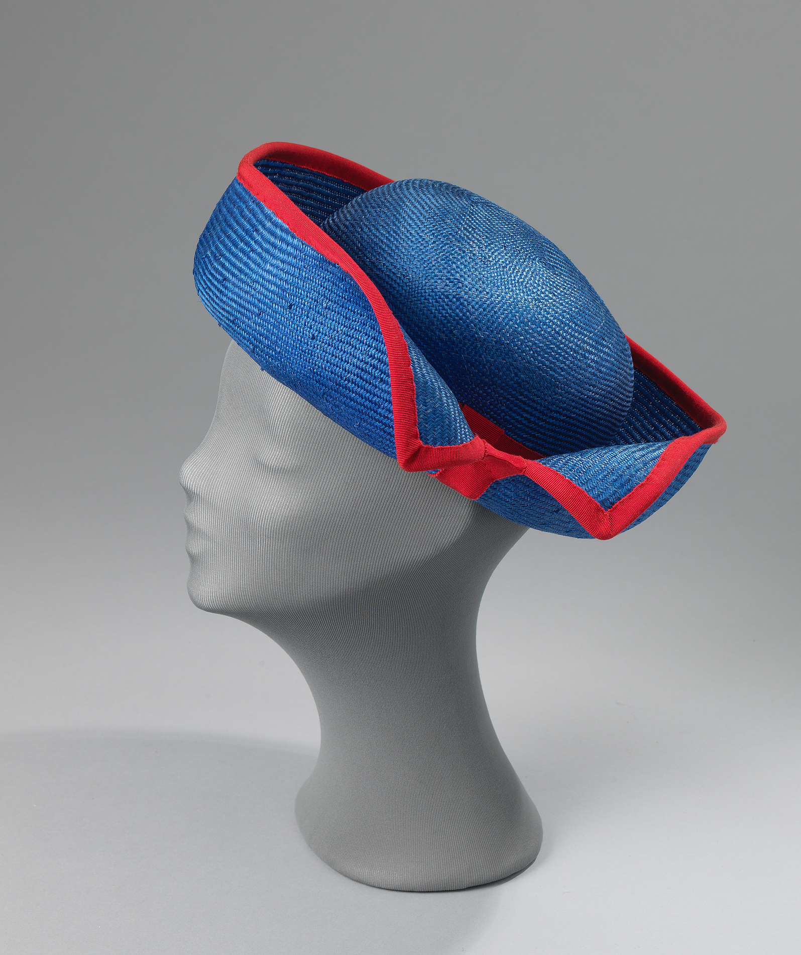 Dameshoed, Breton-model. Ronde bol met omgeslagen rand met inkeping. Blauw sisal, langs rand afgewerkt met rood ripslint. Binnenkant bol is verstevigd met zwarte nylon tule.