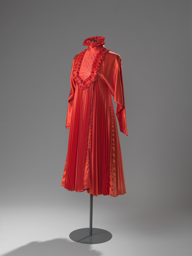 Naast het gebruik van goudleer en applicaties staat Fong Leng bekend om haar ontwerpen met plissé. De rode japon met de opstaande kraag
