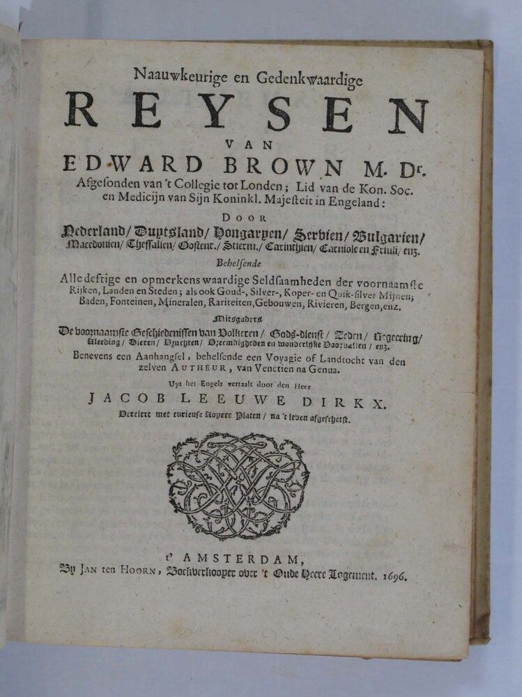 - Naauwkeurige en Gedenkwaardige Reysen Van Edward Brown [...] door Nederland, Duytsland, Hongaryen [...] enz. Amsterdam, Jan ten Hoorn, 1696, 1696