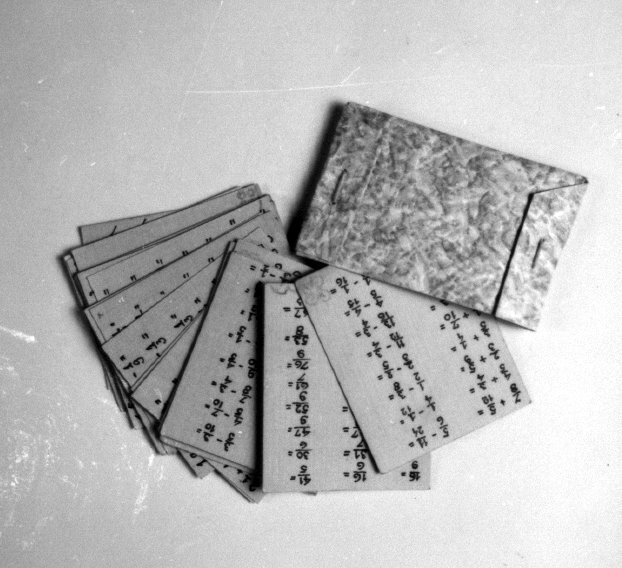 Mapje gemaakt van dik behangpapier en twee nietjes. In het mapje 21 kaartjes met rekensommen. Klein schriftje, grijze kaft en rood ruitjespapier, onbeschreven- Trefwoorden