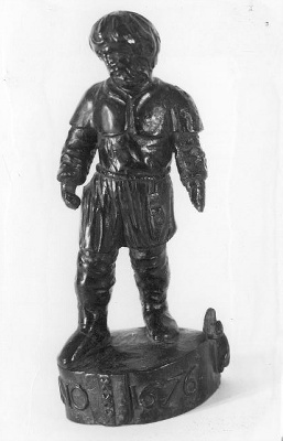 op de Historische Tentoonstelling in 1876 bevond zich onder het hoofd 'St. Pieter's of Vischkoopersgilde' een gesneden palmhouten vismaat, versierd met een palmhouten beeldje van Sint-Pieter, gedateerd 1715. Misschien heeft ook dit beeldje een functie in het gilde gehad. Zie tevens twee korendragers: cat. nr 162, gedateerd 1678, en cat. nr 257, gedateerd 1716. In het Rijksmuseum bevindt zich een aantal vergelijkbare beeldjes: vijf in relatie tot het Korendragersgilde (twee dragers gedateerd 1712 en 1715) en twee turfdragers. Zie ook BA 2138. ( Mieke van der Wal)