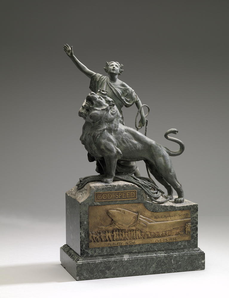 Op 23 oktober 1934 maakte de Uiver tijdens de London-Melbourne Vliegrace een noodlanding in het Australische plaatsje Albury. De plaatselijke bevolking maakte 's nachts met autokoplampen een landingsbaan op de paardenrenbaan van de stad. De volgende dag werd het vliegtuig door de bevolking losgetrokken uit de modder zodat het vliegtuig de race kon vervolgen. Dat laatste moment is afgebeeld op de voet van het beeld. De Uiver zou tweede worden in de race, wat tot veel enthousiasme in Nederland leidde. Helaas zou het vliegtuig nog in december van datzelfde jaar verongelukken in de Syrische woestijn.