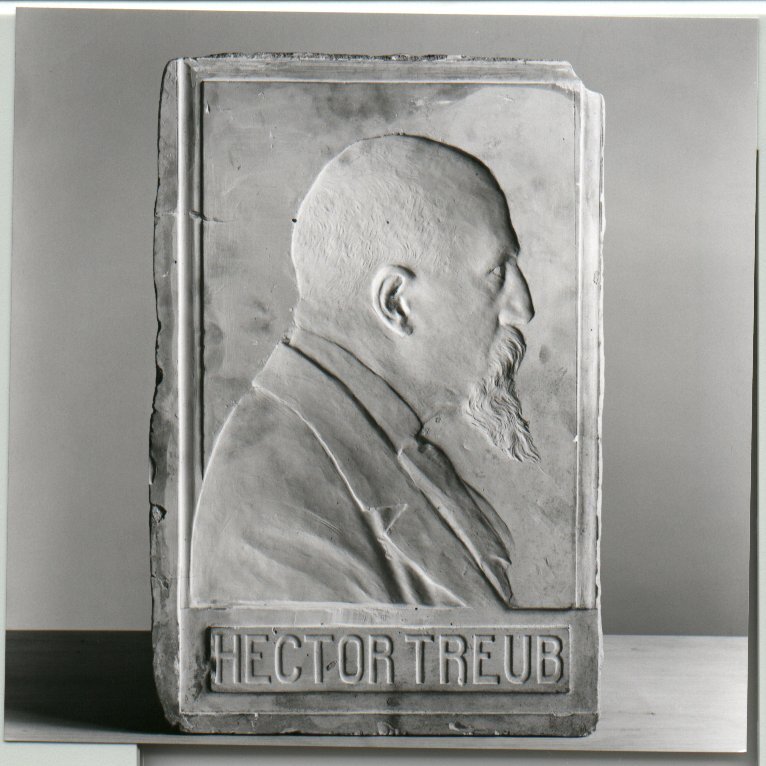Mal van Portretrelieëf van Hector Treub, die als hoogleraar verloskunde van 1896 tot 1920 verbonden was aan de universiteiten van Leiden en Amsterdam. Tot nu toe is het niet gelukt te achterhalen waar zich een afgietsel van deze mal bevindt. Mogelijke aanleidingen voor het vervaardigen van het portret zijn het 25-jarig ambtsjubileum van Treub in 1912 of diens overlijden in 1920. ( Mieke van der Wal)