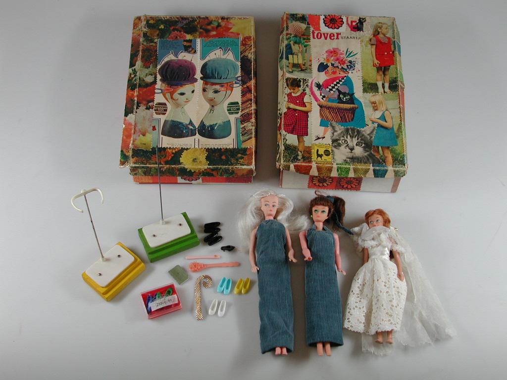 - Drie Barbiepoppen met kleertjes, attributen etc., in twee beplakte schoenendozen, 1960 - 1969