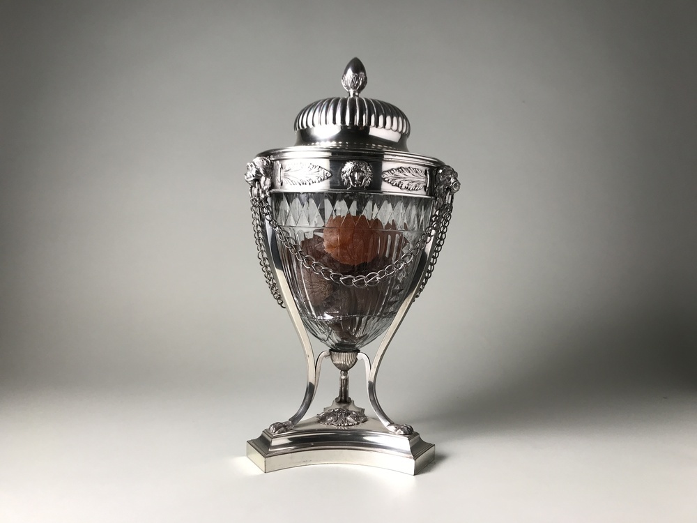 Twee kastanjevazen, elk bestaande uit zilveren houder, urnvormig vat van helder kristal met facet- en diamantslijpsel en los, helmvormig deksel van zilver. Driekantige voet met geprofileerde rand, ingezwenkte zijden en afgeschuinde hoeken. Bovenzijde voet opgelegd met rozet. Op voet een houder in de vorm van een antieke drievoet op leeuwenklauwen, de bovenzijde met drie leeuwenmaskers en een fries met bacchuskoppen en palmetten. De maskers met ringen, door dubbele kettingen met elkaar verbonden. Drie beugels met geribde dop ter ondersteuning van glazen vat. Deksel met vlakke rand, insnoering en bovenzijde met straalsgewijs een krans van godrons. Dekselknop in de vorm van een eikel.