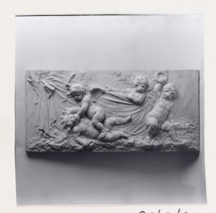 als voorbeeld voor dit reliëf heeft een reliëf door François Duquesnoy gediend, voorstellende de strijd tussen hemelse en aardse liefde. Van Duquesnoys reliëf zijn verschillende exemplaren bekend, uitgevoerd in terracotta en marmer. Er zijn talloze kopieën van vervaardigd. De signatuur 'P.XAVE¬RYE 1735' klopt niet: Pieter Xavery overleed circa 1673. Stilistisch is het bovendien waarschijnlijk dat het beeld 18de-eeuws is. Een vergelijking met een reliëf dat het mono¬gram J:B:X: draagt (Jan Baptist Xavery) leidt tot de veronderstelling dat wellicht deze de maker is. ( Michiel Jonker)