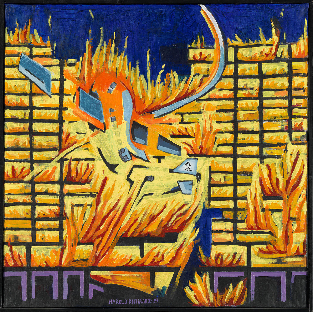 In de maanden na de Bijlmerramp op 4 oktober 1992 schilderde kunstenaar Harold Richaards (Paramaribo, 1957) de brandende flats waar de El Al Boeing zich in boort als een wand van vuur. Bij de Bijlmerramp kwamen 43 mensen om. Donderdag is het twintig jaar geleden.