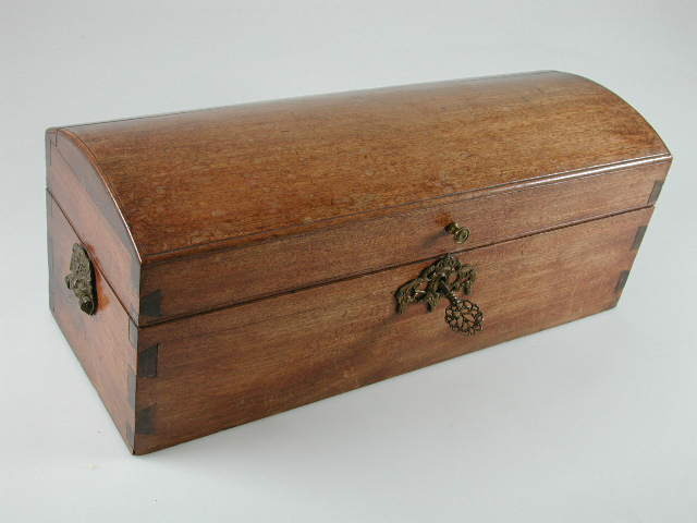 Bokaal en deksel geborgen in rechthoekige kist van eikenhout, met koffervormig scharnierend deksel en koperen beslag. Voorzijde met bolvormig knopje en sleutelplaat in de vorm van een guirlande. Koperen sleutel. Korte zijden, elk met een oor in de vorm van een leeuwenmasker met (thans ontbrekende) ringen in de bek. Interieur bekleed met rood fluweel, met goudgalon afgebiesd.