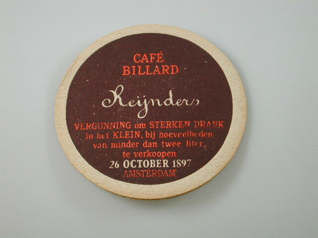 - tekst bovenzijde: CAFÉ/ BILLARD/ Reijnders/ VERGUNNING om STERKEN DRANK/ in het KLEIN, bij hoeveelheden/ van minder dan twee liter,/ te verkoopen/ 26 OCTOBER 1897/ AMSTERDAM