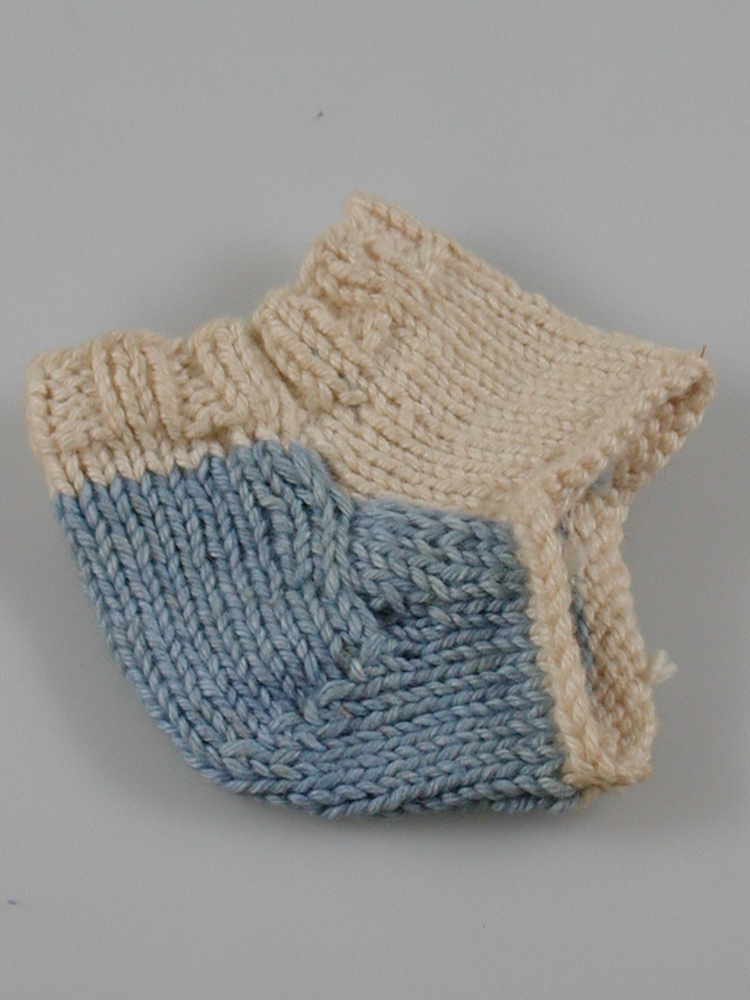 Gebreid hieltje van naturelkleurig/blauw breikatoen. Handwerkproef van mevr. R.A.J. Grabrandt.- Trefwoorden