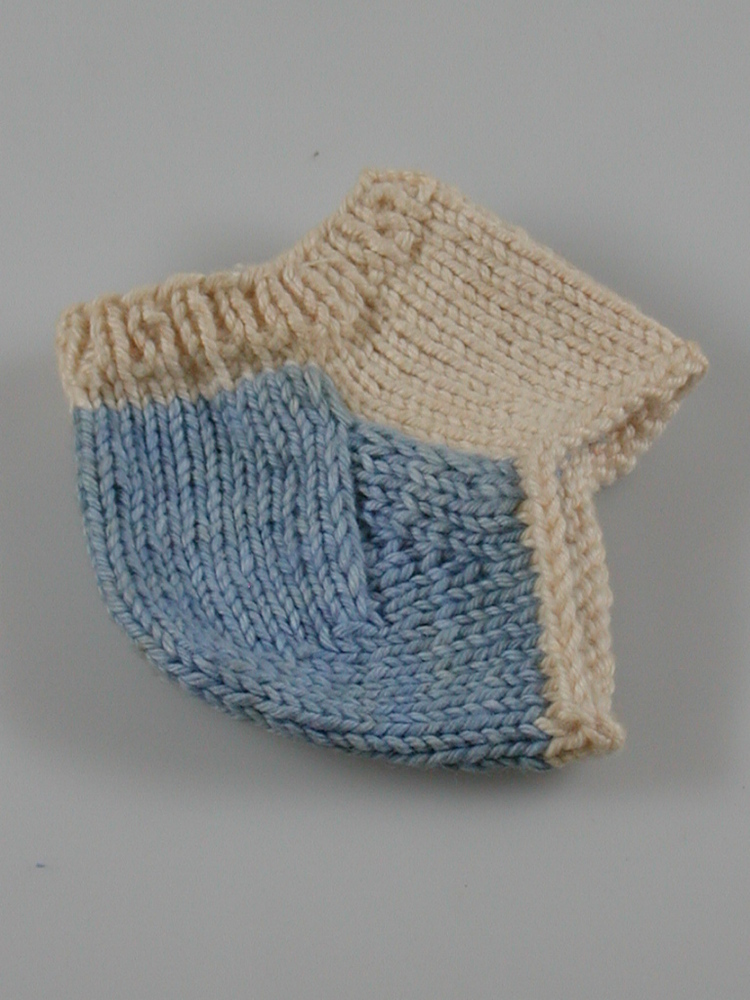 Gebreid hieltje van naturelkleurig/blauw breikatoen. Handwerkproef van mevr. R.A.J. Grabrandt.- Trefwoorden