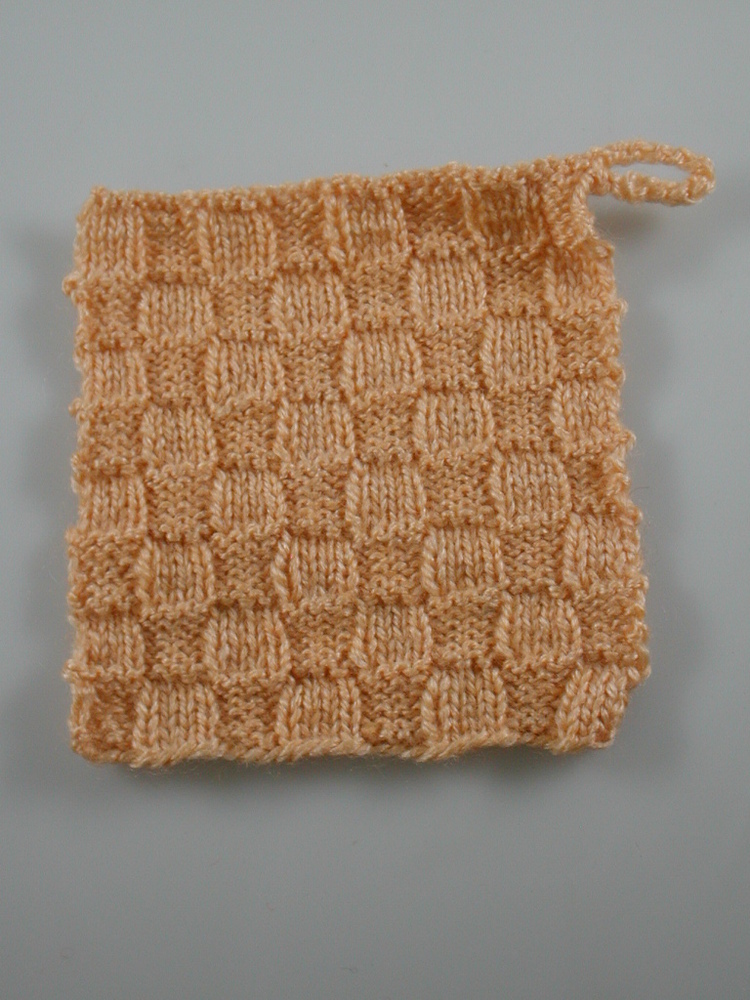 Gebreide pannenlap van zalmkleurig katoen. Handwerkproef van mevr. R.A.J. Grabrandt.- Trefwoorden