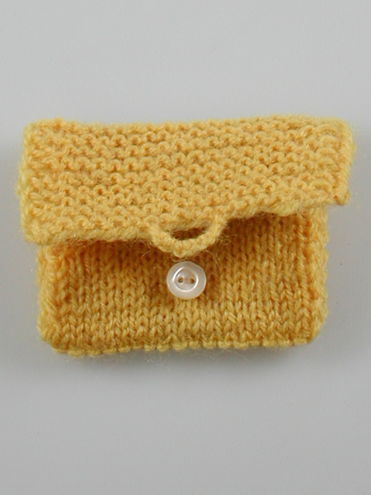 Gebreid tasje met klep van geel katoen. Handwerkproef van mevr. R.A.J. Grabrandt.- Trefwoorden
