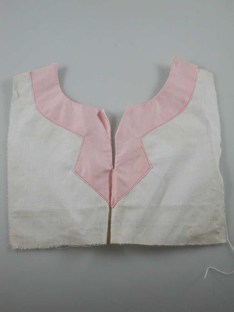 Halsafwerking van naturelkleurige katoen. Split middenvoor met in vorm geknipt, in punt eindigend, stuk roze katoen erop gestikt. Handwerkproef van mevr. R.A.J. Grabrandt.- Trefwoorden