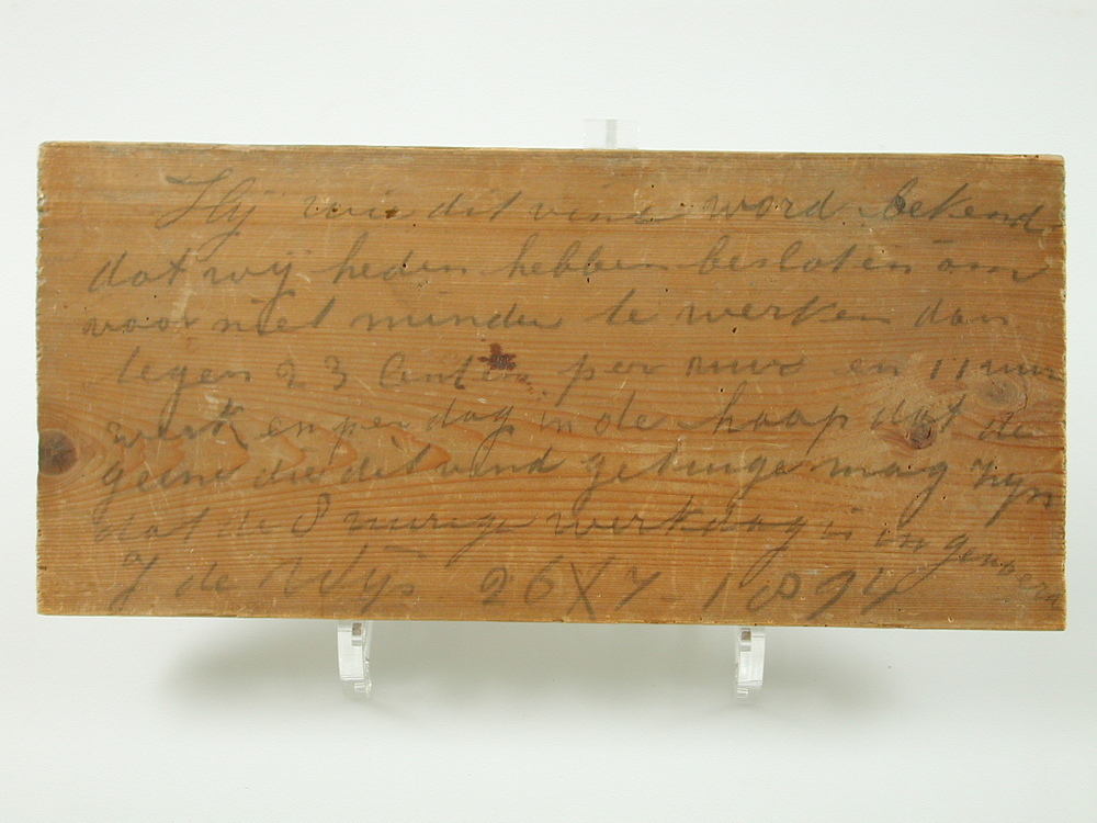 opschrift bovenzijde: Hij wie dit vind word bekend/ dat wij heden hebben besloten om/ voor niet minder te werken dan/ tegen 23 Centen per uur en 11 uur/ werken per dag in de hoop dat de/ geene die dit vind getuige mag zijn/ dat de 8 uurige werkdag is in gevoerd./ J. de Wijs 26 X 7 1894/
