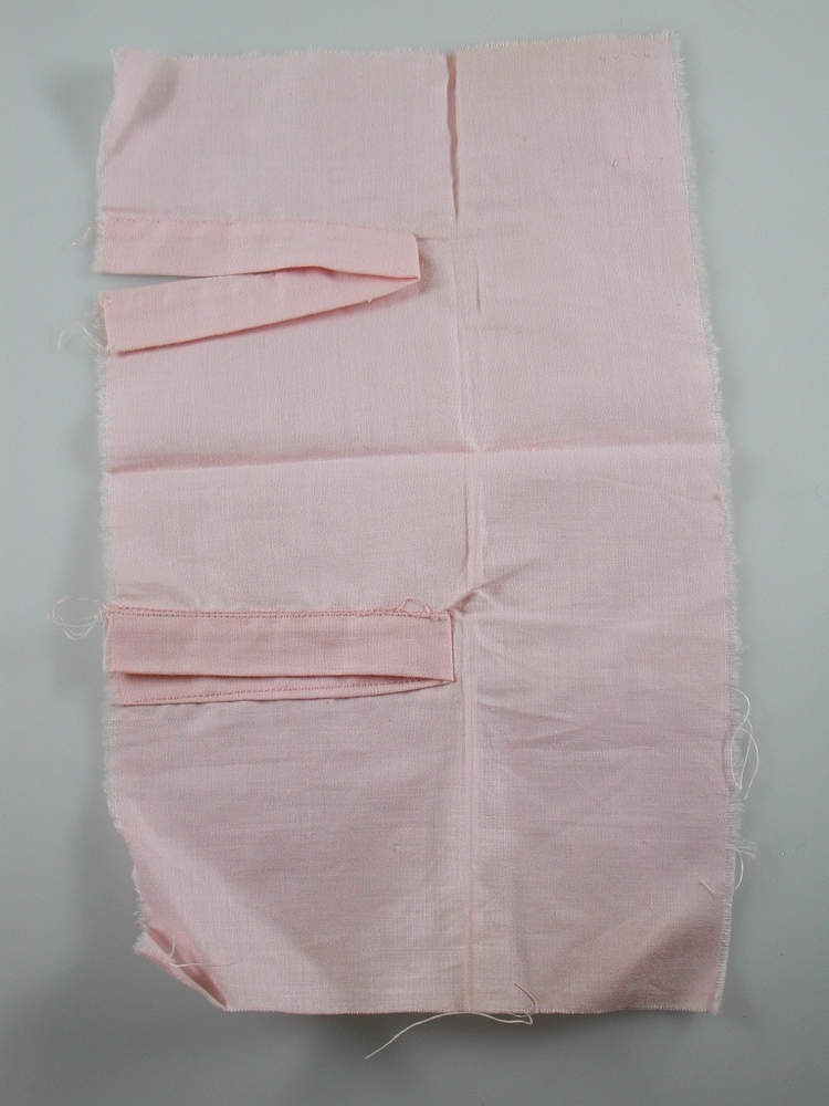 Roze katoenen lapje met split. Handwerkproef van mevr. R.A.J. Grabrandt.- Trefwoorden