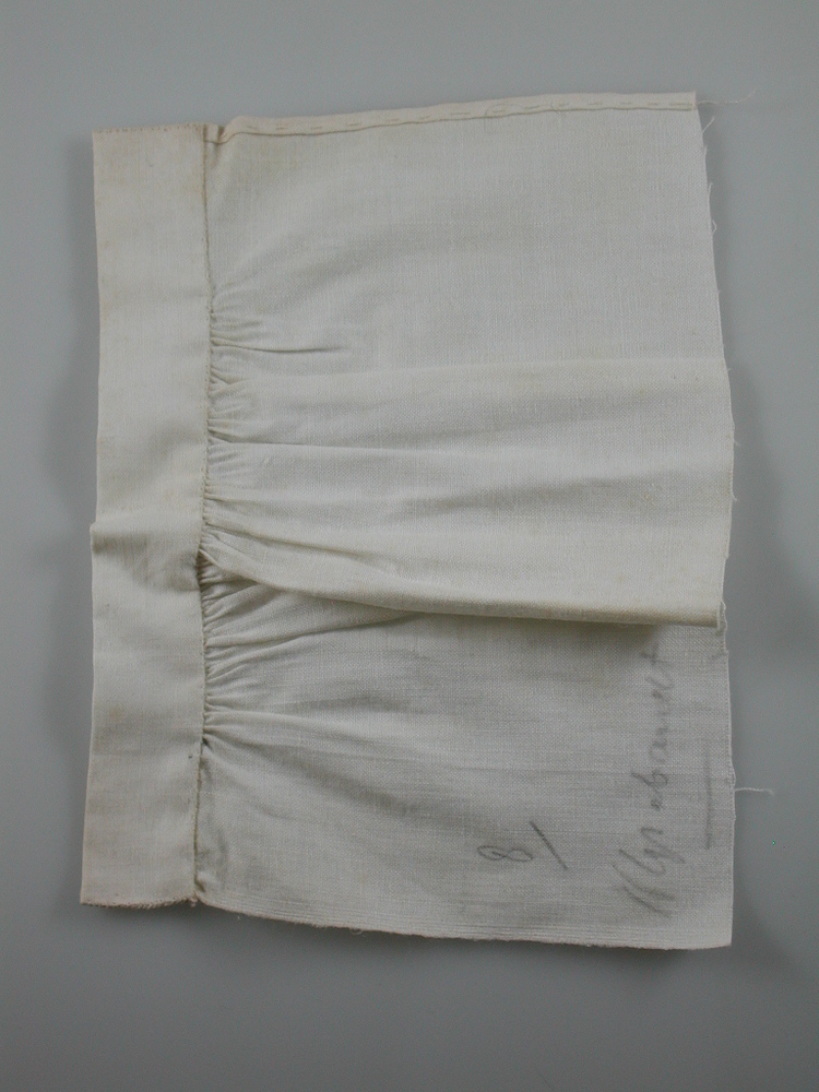 Aangerimpeld wit katoenen lapje op band. Handwerkproef van mevr. R.A.J. Grabrandt.- Trefwoorden
