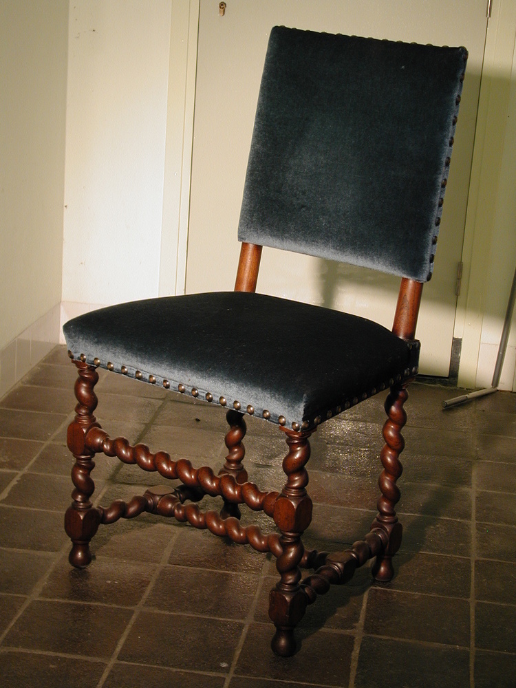 Genre renaissance-/barokstoelen op getorste poten verbonden door eveneens getorste sporten. Vrij rechte rug. Rust op bolpootjes. Vaste stoffering op zitting en rug. Waarschijnlijk een 19de eeuws ensemble, behorend bij tafel (inv.nr KB 2655).