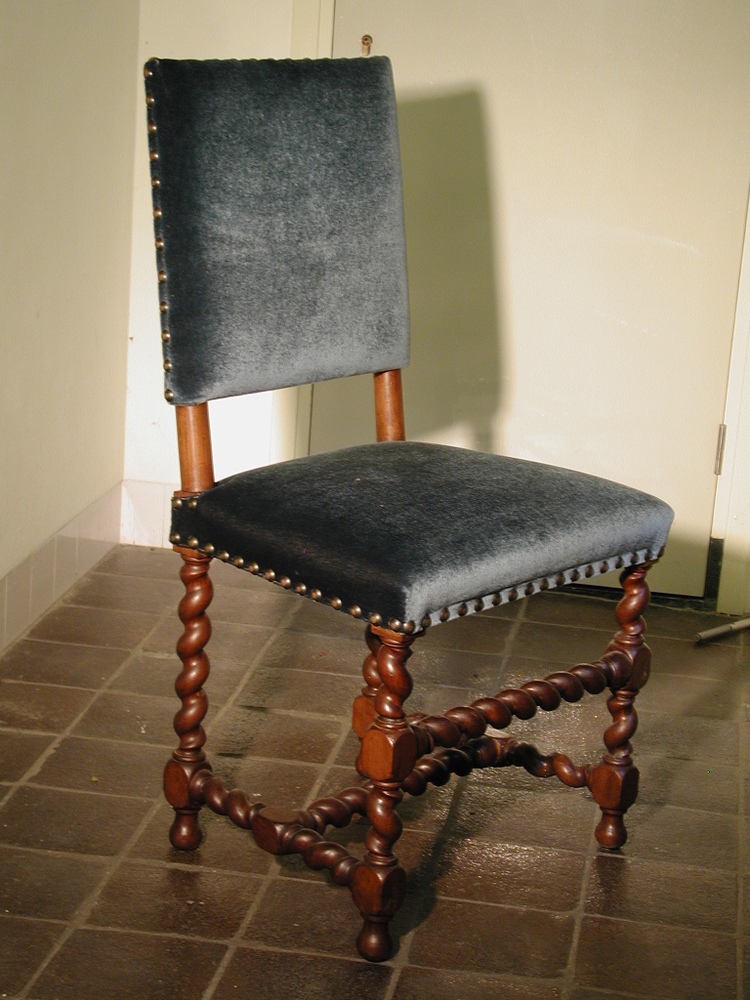 Genre renaissance-/barokstoelen op getorste poten verbonden door eveneens getorste sporten. Vrij rechte rug. Rust op bolpootjes. Vaste stoffering op zitting en rug. Waarschijnlijk een 19de eeuws ensemble, behorend bij tafel (inv.nr KB 2655).