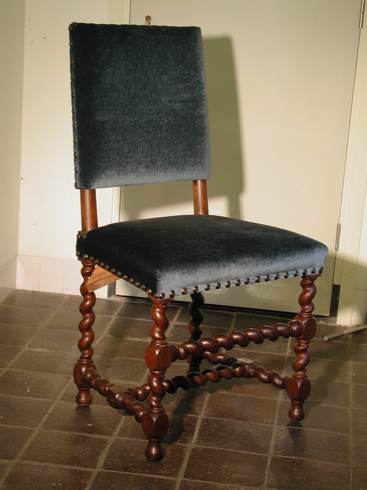 Genre renaissance-/barokstoelen op getorste poten verbonden door eveneens getorste sporten. Vrij rechte rug. Rust op bolpootjes. Vaste stoffering op zitting en rug. Waarschijnlijk een 19de eeuws ensemble, behorend bij tafel (inv.nr KB 2655).