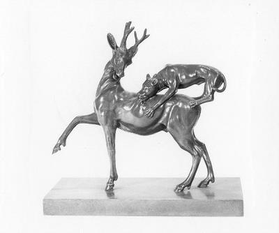 Kopie naar 'Hert met hond' (in particuliere verzameling) toegeschreven aan Francesco Fanelli (werkzaam 1608-1665). Een verwante, eveneens aan Fanelli toegeschreven groep, waarbij de beide voorpoten van het hert opgeheven zijn, is een kopie naar een Romeins marmeren beeld uit de collectie van de Vaticaanse Musea te Rome. ( Mieke van der Wal)
