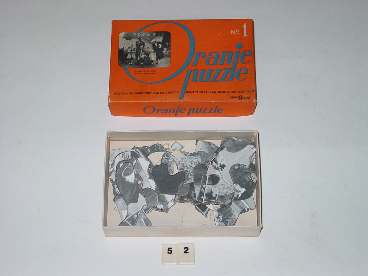 kartonnen doos met legstukken; gelegde en gefixeerde puzzel.- Trefwoorden