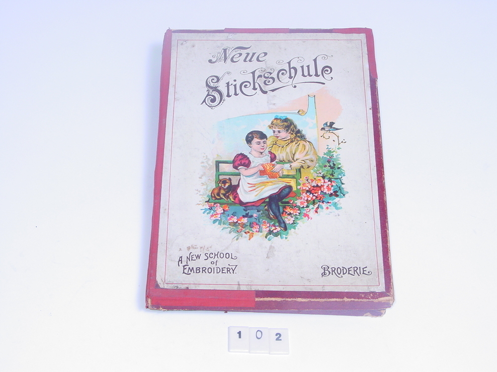 Borduuroefening in de vorm van geperforeerde kaarten. Inhoud: kartonnen doos met verschillende kaarten, waarvan sommigen reeds geborduurd. Tevens aanwezig: annonce van kleermaker, Amsterdam september 1878.- Trefwoorden