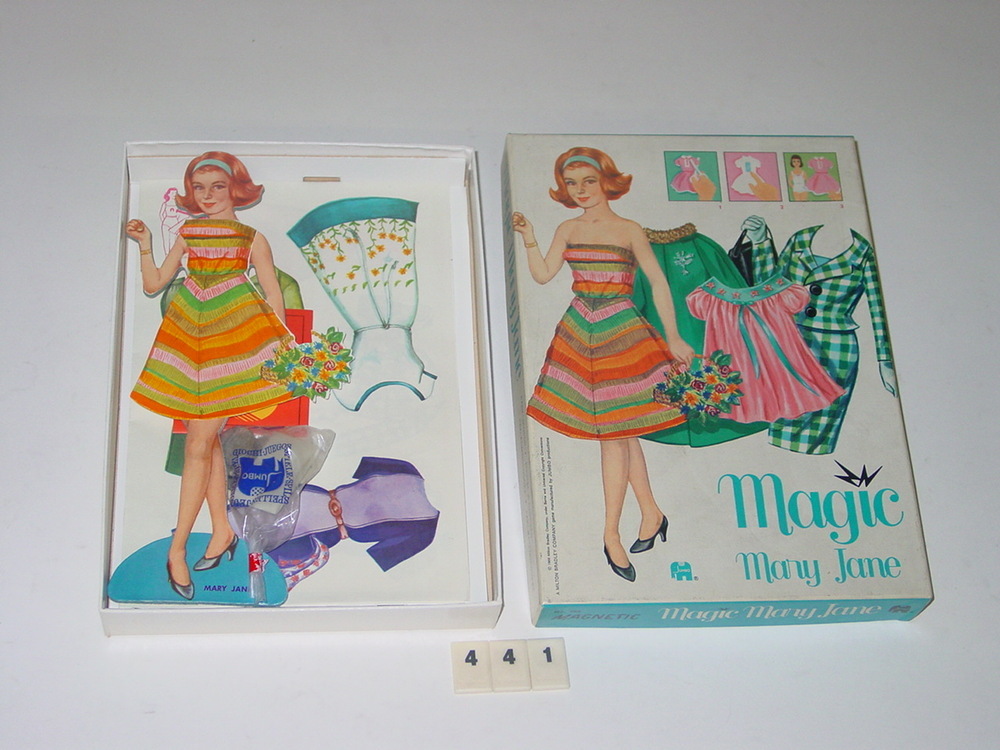 kartonnen pop met magneet; vel met kledingstukken; blikken rondjes voor