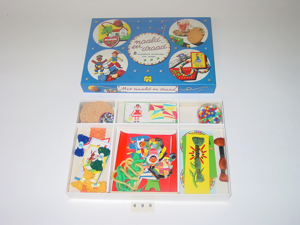 Doos met 8 verschillende handwerkjs o.a. borduren, kralen, rijgen, enz.