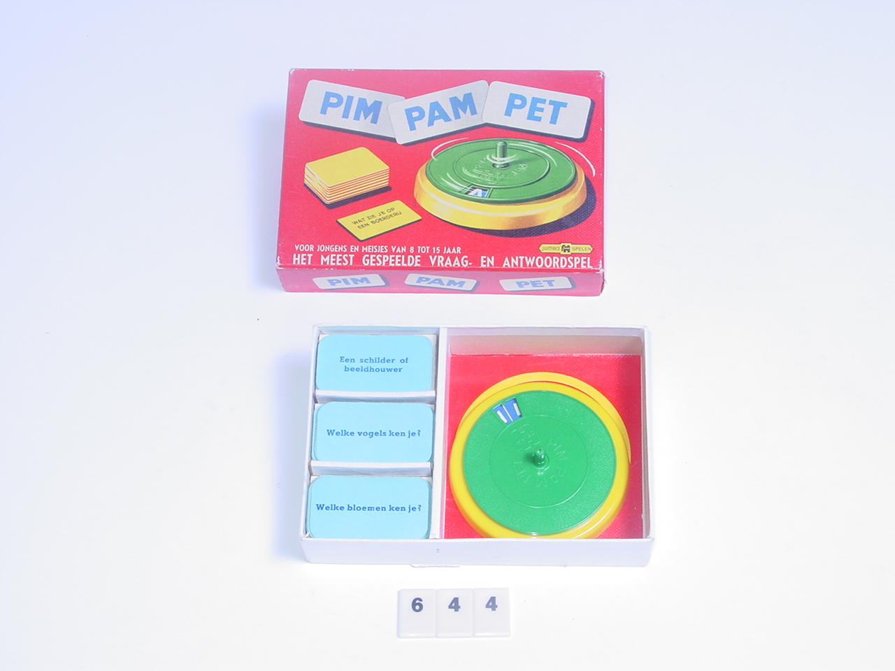 Vraag- en antwoordspel. Inhoud van rechthoekige doos met deksel: vragenkaartjes en draaischijf met letters. Handleiding is op achterzijde deksel gedrukt.- Trefwoorden