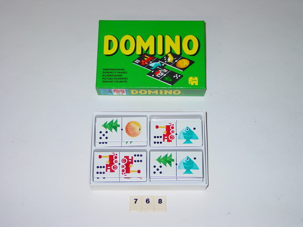 Prentendomino. Inhoud van rechthoekige doos met deksel: 28 kaarten met op elke kaart twee plaatjes, spelregels, garantiebewijs.- Trefwoorden