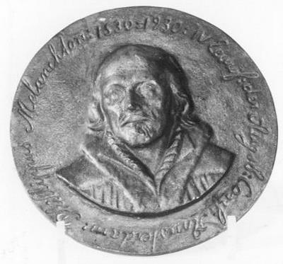 Plaquette uitgegeven in 1930 ter gelegenheid van het feit dat vierhonderd jaar geleden de hervormer Melanchton de Augsburgse Confessie, de eerste Lutherse belijdenisgeschriften, opstelde. ( Mieke van der Wal)