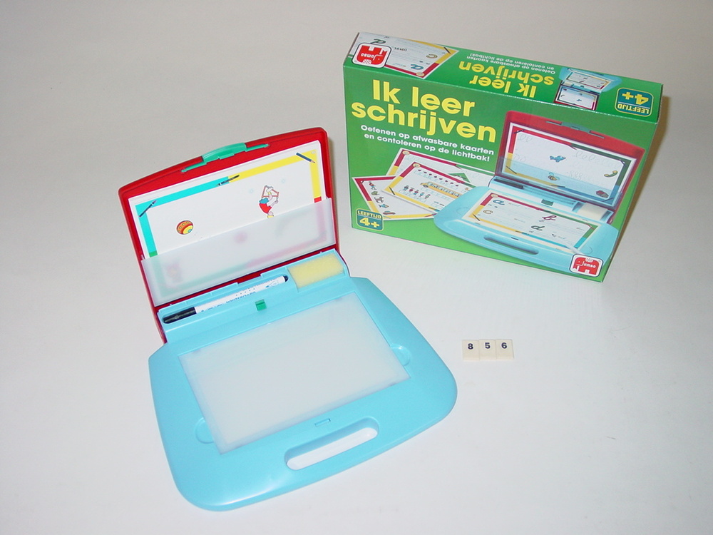 koffertje met lichtbak, 20 afwasbare kaarten, sponsje, pen, spelregels.- Trefwoorden
