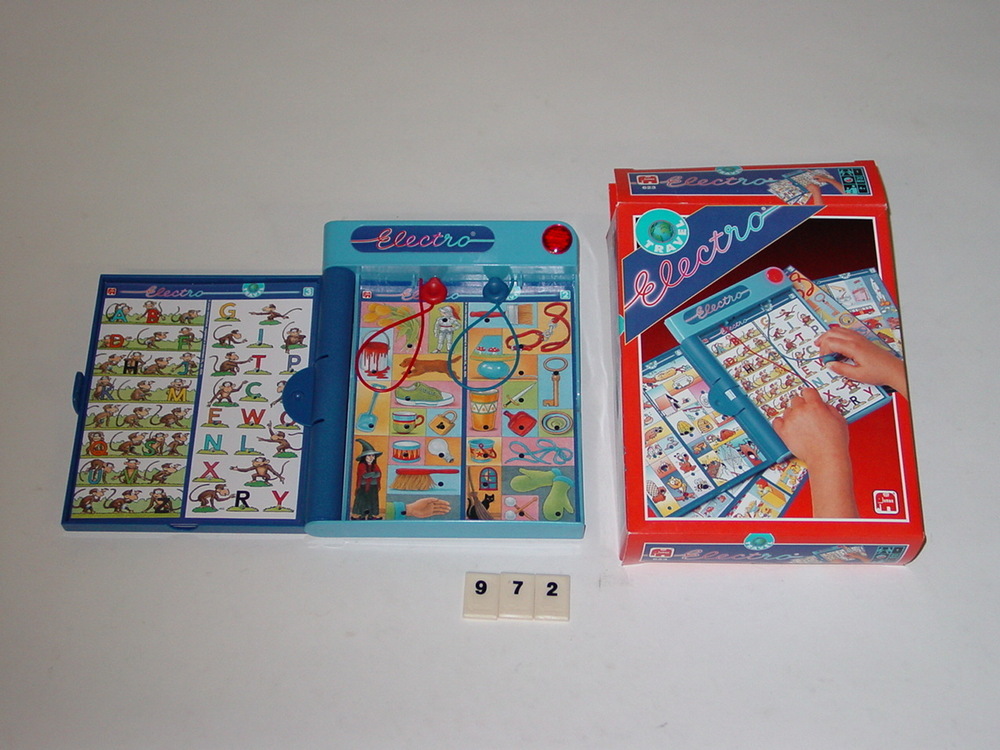 Reisversie Electro. Het spel bestaat uit een plastic sluitbare doos.