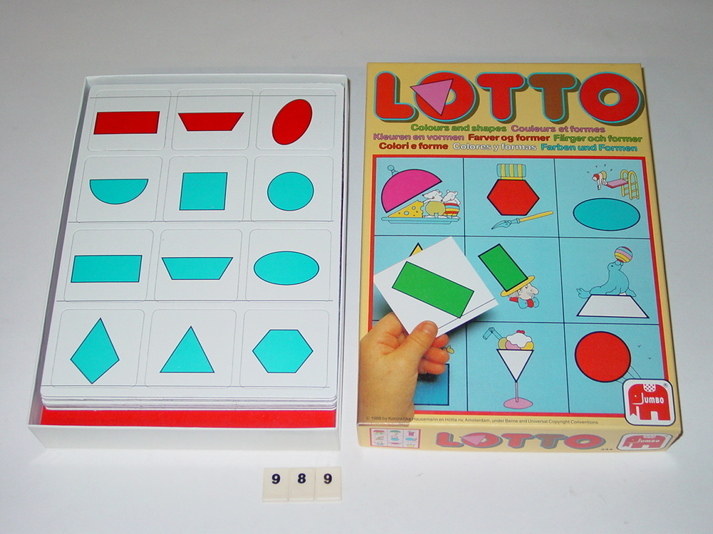Prentenlotto met vormen en kleuren. Inhoud van rechthoekige doos met deksel: zes kaarten, 54 kaartjes, spelregels, garantiebewijs.- Trefwoorden