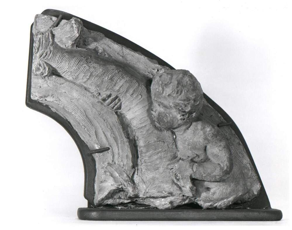 fragment van de linkerhelft van een schets voor de marmeren bekroning boven de deur, toegang gevend tot de kamer van de Thesaurie Extra-Ordinaris in de zuidwesthoek van de zuidelijke galerij van het 17de-eeuwse stadhuis. De schets wordt in een Quellinus-rekening uit 1651 vermeld.1 In 1652 kwam de verwezenlijking in marmer van deze bekroning, links van het reliëf met de god Apollo, gereed.