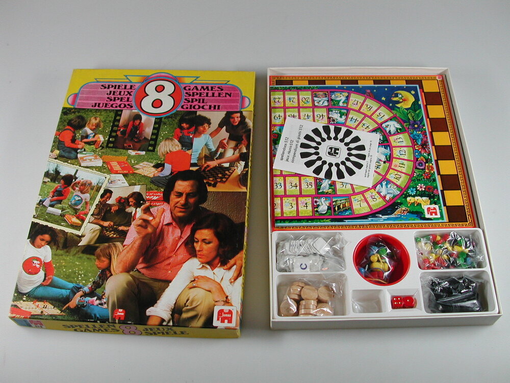 Spellendoos met daarin 8 spellen: dammen, ganzenbord, halma, mens erger je niet, alphabet, quick, vlooienspel, wedrenspel. 3 speelborden, damstenen, pionnen, letterfiches, bakje, speelstukken, dobbelstenen, spelregels, garantiebewijs.- Trefwoorden