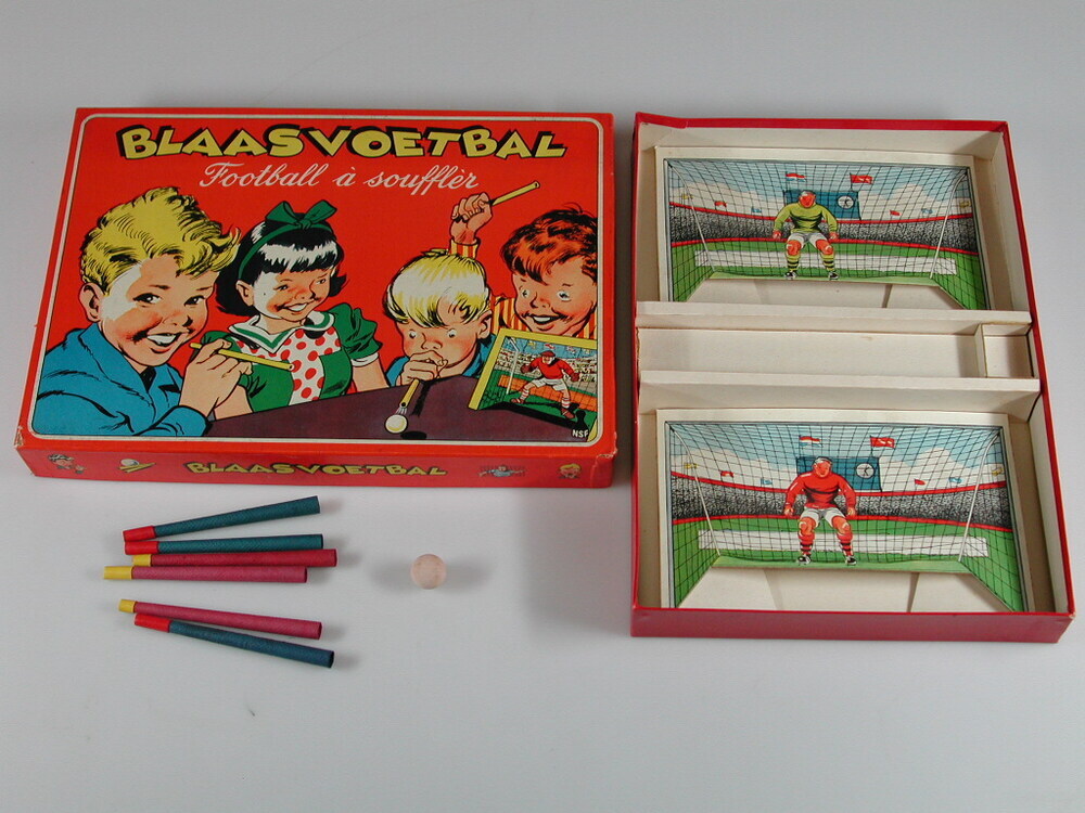 Kartonnen goals, 6 blaaspijpjes, houten bal.- Trefwoorden