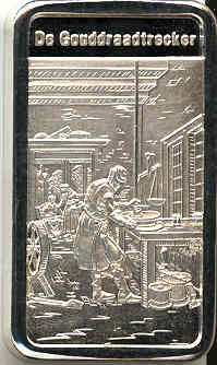 voorzijde: in zilver gegraveerde afbeelding van een gouddraadtrekker in zijn atelier. Bovenaan een opschrift.