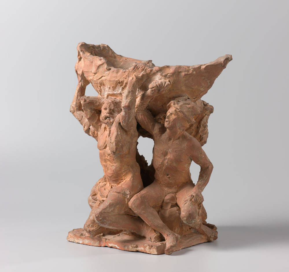 schets voor een - niet uitgevoerde - pompbekroning op de zuidelijke binnenplaats van het 17de-eeuwse stadhuis. Zie voor de bekroning van de noordelijke binnenplaats: cat. nr 102. De pompbekroningen worden in een rekening uit 1652 vermeld als: 'gebotcheert om op de plaetse vant nieuw stadhuys te stellen, op elcke pomp 4 belden aen malkanderen'. Voor elke beeldengroep ontving Quellinus 24 gulden. In 1664 waren de modellen op ware grootte gereed, maar om onbekende redenen werden ze niet uitgevoerd. De aan Quellinus verschuldigde 1000 gulden werden door de thesauriers met andere posten verrekend. In de Notitie uit 1769 van Ploos van Amstel wordt de geboetseerde bekroning van het model met het schip, zijnde een 'groep van vier beelden draagende een boot zinnebeeldig op de zeevaart', vermeld.