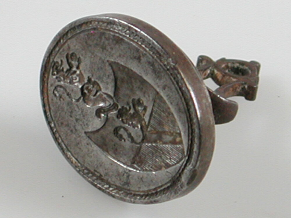 Ovaal cachet waarop wapenschild met helm. Metalen handvat.- HerkomstAfkomstig uit nalatenschap van Petronella Marie Suzanne Backer van Leuven (1878-1961)