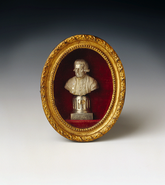 Zilveren borstbeeld, driekwart en face, van man gekleed in schutterstenue, op gecanneleerd voetstuk tegen ovale achtergrond van rood fluweel, besloten in geprofileerde lijst van goudkleurig metaal. Op voorzijde voetstuk is gegraveerd: ISAAC VAN GOUDOEVER/ COLONEL der SCHUTTERY/ Gebooren in Amsterdam,/ den 29 Augustus 1712./.