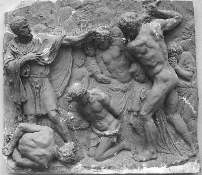 schets voor een van de drie marmeren gerechtigheidsreliëfs in de Vierschaar van het 17de-eeuwse stadhuis, het reliëf rechts. Zie voor de beide andere reliëfs: BA 2518 en BA 2517. In 1651 ontving Quellinus voor het boetseren van een 'platte historie representerende Junius brutus' 200 gulden. In de verzameling van Valerius Röver (1686-1739) bevond zich een geboetseerd gerechtigheidsreliëf met Brutus, maar of dit identiek is met het reliëf dat zich in stadsbezit bevindt is niet zeker. In de Notitie uit 1769 van Ploos van Amstel wordt het model als 'de rechtspleging van Brutus over zijne zoonen: Basrelief uijt de vierschaar' vermeld. In een ongedateerde lijst van vóór 1806 (1802/03?) is daarnaast sprake van 'een zoon van Brutus'. In 1990 kwam op een veiling in Londen een tweede, compleet bewaard gebleven, Brutus-reliëf aan het licht.