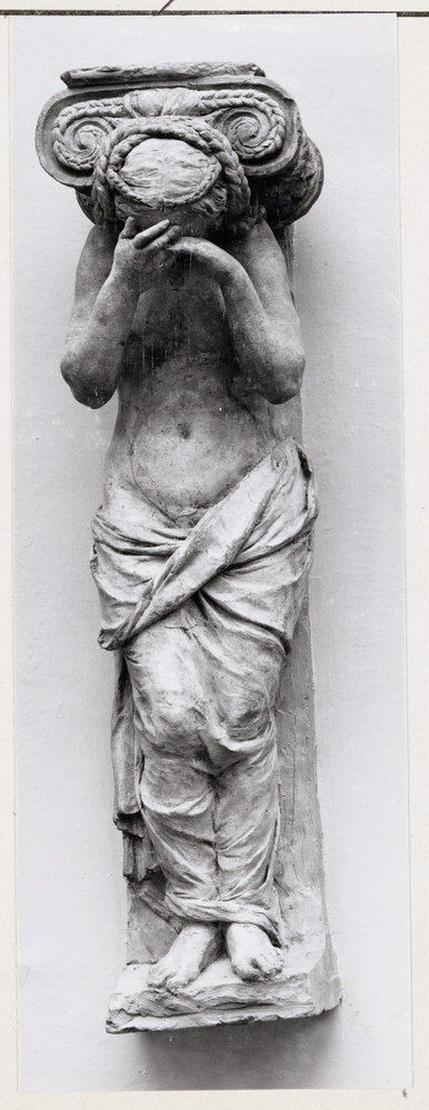 schets voor een van de vier marmeren kariatiden in de Vierschaar van het 17de-eeuwse stadhuis, de eerste figuur van links. In 1650 ontving Quellinus 240 gulden voor de vervaardiging van vier geboetseerde 'bedructe en gevange vroubelten'. De marmeren kariatiden werden twee jaar later voor 800 gulden per beeld gehakt. In dezelfde rekening wordt een bedrukte vrouwentronie met een kapiteel op het hoofd vermeld voor 15 gulden. In zijn Notitie uit 1769 vermeldt Ploos van Amstel de aanwezigheid in de Kunstkamer van 'de vier Cariatiden van de vierschaar', alsmede van een 'hooft met een borst van een van de Cariatiden uit de vierschaar'. Van deze losse kop rest thans geen spoor. Kariatiden zijn bekend uit de bouwkunst van de klassieke oudheid. De bedrukte en gevangen vrouwen van Quellinus herinneren aan soortgelijke figuren van onder andere Cornelis Floris (1514-1575) en zijn school.
