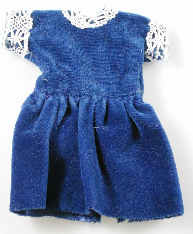 Blauwe fluwelen jurk, kort model, met aangeknipte korte mouw en aangerimpelde rok. Aan de hals en mouwen is kloskant bevestigd.- Trefwoorden